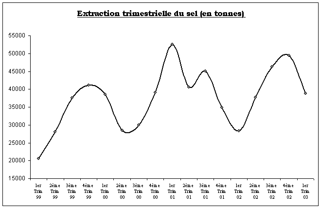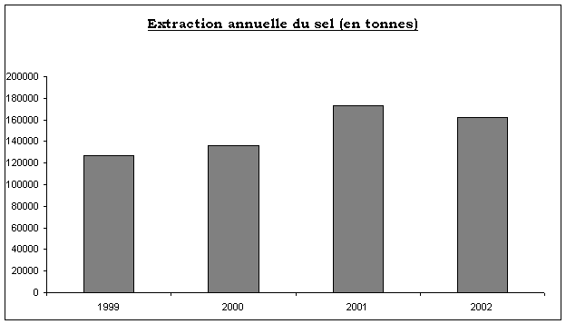 Les entreprises ont extrait 49 370 tonnes de sel au 4ème trimestre 2002, soit une baisse de 21,3% sur une période de 3 mois. Cette situation pourrait s’explique par l’irrégularité de la présence des différentes sociétés sur le site.