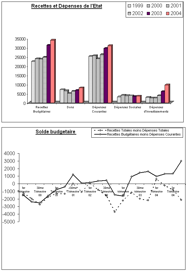 Les dons budgétaires qui constituent des ressources d’appoint aux ressources intérieures mobilisées , leur niveau a atteint 51 millions de FD en 2004 contre 1,350 milliards de FD soit forte chute de 96,2%