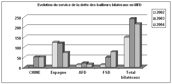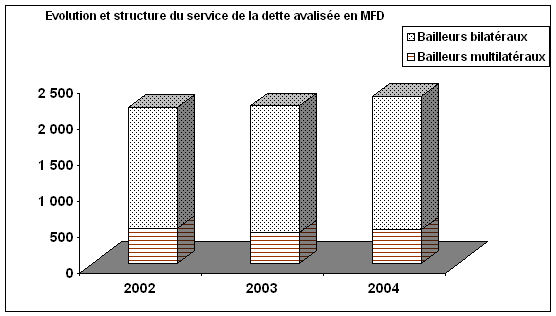 En 2004, l’Etat a totalement amorti le prêt BIS mais a contracté un nouveau prêt auprès de la BCI-MR. Ce qui tend à expliquer la hausse de 16% du service de la dette intérieure de 2003 à 2004. Les prêts contractés auprès des établissements bancaires sont des prêts de court terme destinés à combler le déficit de trésorerie.