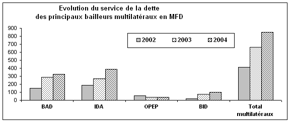 Pour la dette multilatérale, on note une tendance à la hausse du service de la dette. Ainsi, les charges des emprunts sont passées de 674 millions FD en 2003 à 867 millions FD en 2004, soit une croissance de 29%. Les principaux créanciers en 2004 sont l’IDA et la BAD avec respectivement 44% et 38% du montant total des mandats suivi de loin par la BID (12%) et l’OPEP (4%).
