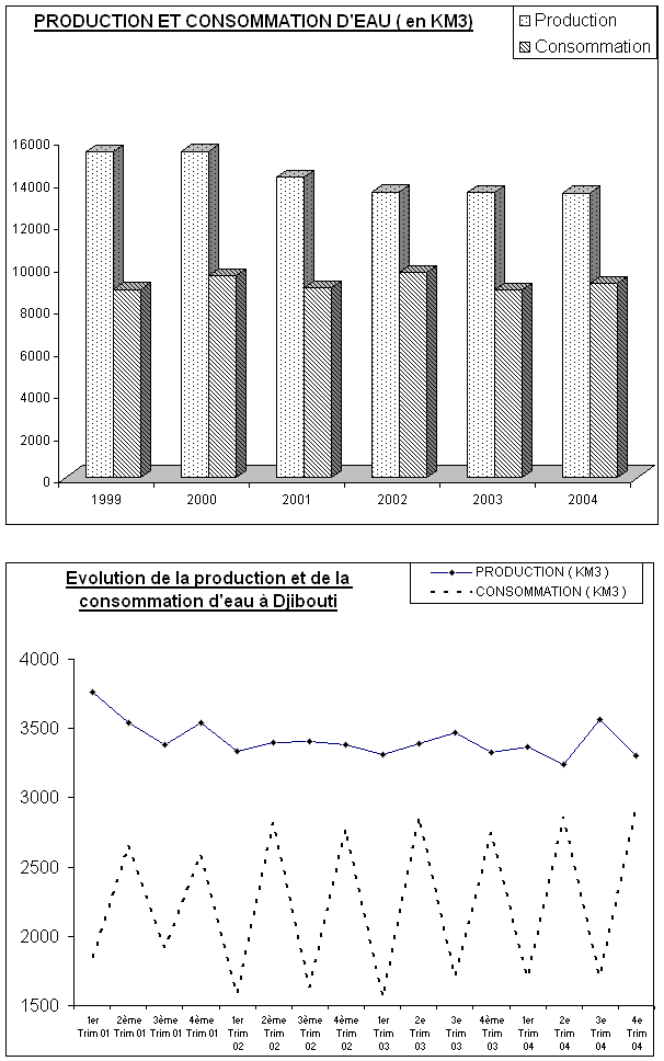 · Le volume de production d’eau courante qui s’élève à 13,472 millions de m3 accuse une très légère baisse de 0,1% en 2004 par rapport à l’année 2003. Le volume de production enregistré dans Djibouti-ville soit 87% de la production connaît une hausse de 2,6% alors que celle des Districts affiche une baisse de 16,7% au cours de la même période.