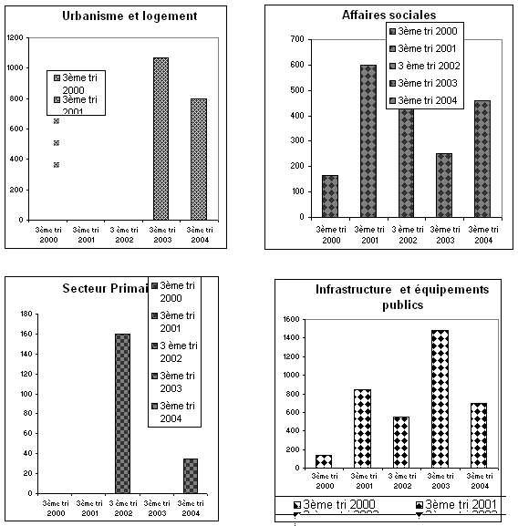 4-Autres projets sociaux (19 %) : Il s’agit principalement de la poursuite de l’exécution des projets de santé financés par la Banque mondiale (lutte contre le sida et développement de la santé ) ainsi que ceux relatif à la lutte Contre la pauvreté ( F S D , A D E T I P) et la promotion de la femme.