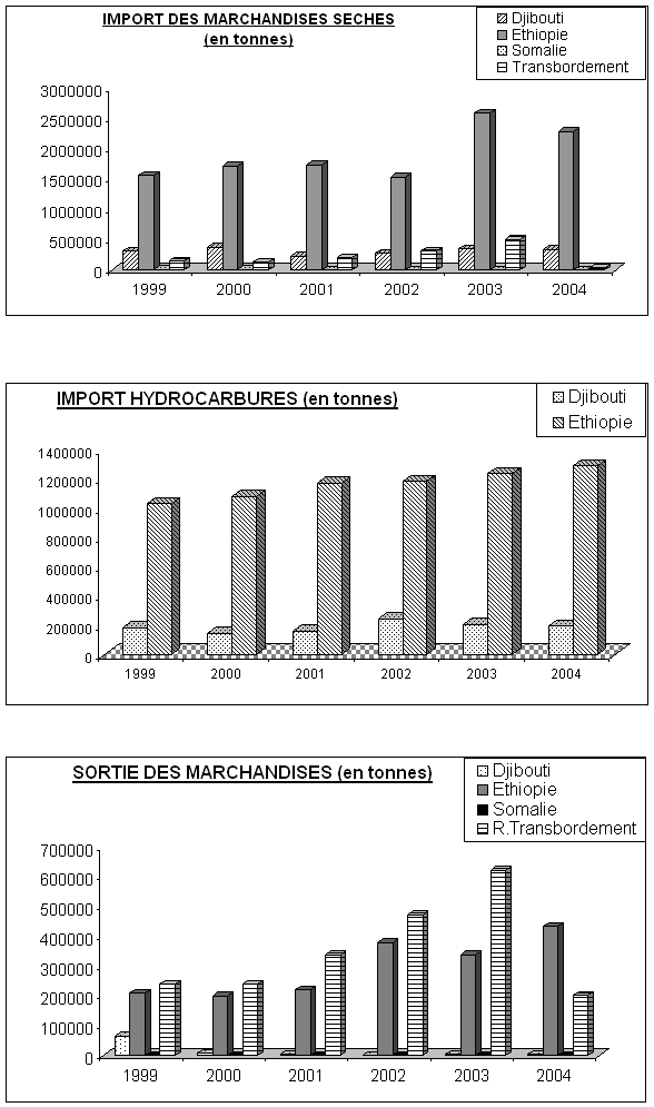 Bien que les exportations éthiopiennes en marchandises sèches, qui représentent l’essentiel de l’activité à la sortie du port (68%)aient augmenté de 28%, la forte diminution du volume de transbordement (- 67% sur un an ) a entraîné une baisse de l’ensemble des exportations. Au cours de l’année 2004, le transbordement représente 31,7% de l’activité à la sortie du port alors qu’il représentait 64,5% une année auparavant