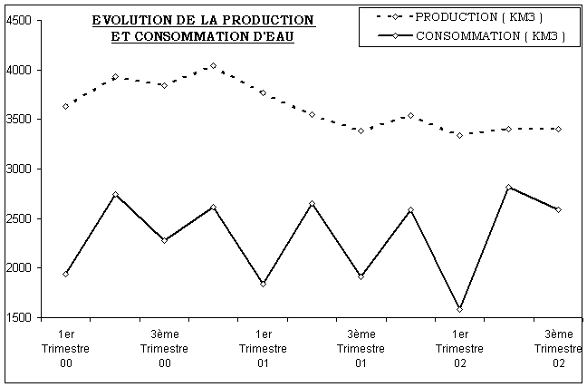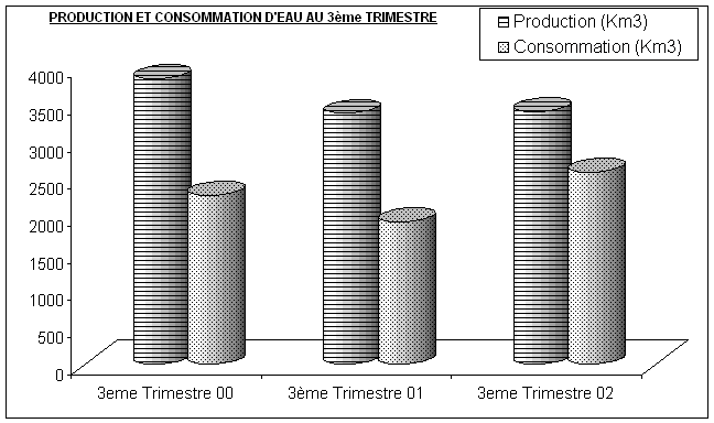 Par ailleurs, le volume de la consommation facturée a connu une forte augmentation de 35,2 % sur une période d’une année, en passant de 1 915 Km3 au 3ème trimestre 2001 à 2 589 Km3 au 3ème trimestre 2002.