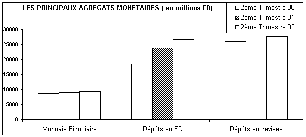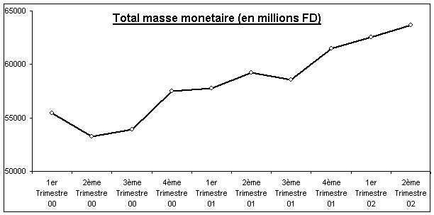 La masse monétaire totale s’établit à 63,693 milliards FD en juin 2002 et connaît une croissance de 2,2 % en trois mois et de 7,5 % en un an.