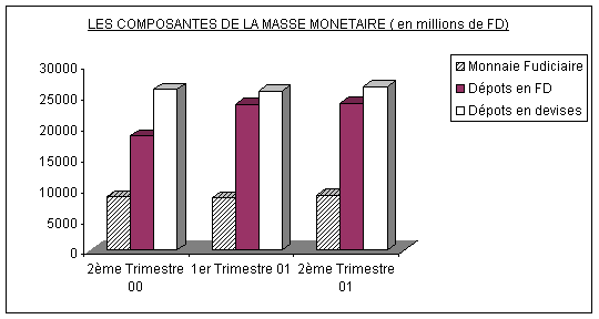 La masse monétaire totale au 2ème trimestre s’élève à 59,231 milliards FD et enregistre une hausse de 2,49 % par rapport à celle du 1er trimestre 2001, et également une hausse de 4,8 % sur une période d’une année.