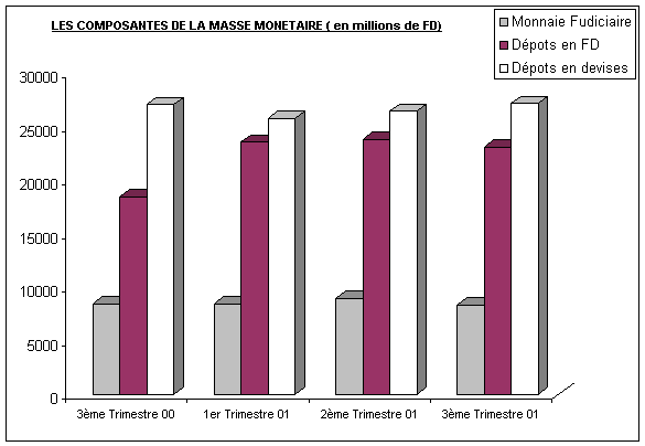 La masse monétaire totale au 3ème trimestre 2001 qui s’établit à 58,593 milliards FD enregistre une légère baisse de 1% sur un trimestre et une hausse de 2,3 % sur une période d’une année.