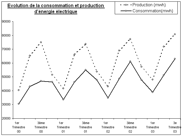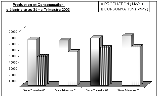 · La consommation en énergie s’élève à 62 932 MW au 3ème trimestre 2003 ce qui correspond à une légère augmentation de 2,9 % comparée à la même période de l’année 2002.
