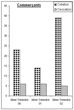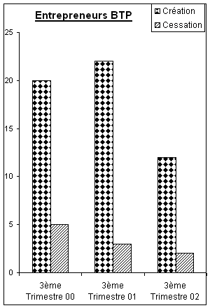Ce chiffre est en forte hausse de 68 % par rapport à son niveau de l’année dernière à la même période. Avec 39 nouvelles demandes enregistrées ce trimestre contre seulement 6 au 3ème trimestre 2001, c’est surtout l’activité des « commerçants » qui a connu une hausse spectaculaire, tandis que l’activité des « entrepreneurs BTP » a baissé de 45 % en un an.