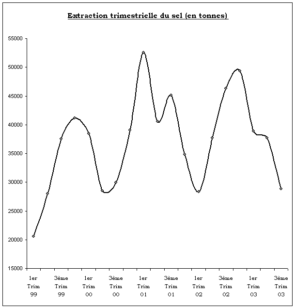 La production du sel du Lac Assal s’établit à 28 817 tonnes au 3ème trimestre 2003 contre 34 818 tonnes à la même période de l’année dernière, soit une baisse annuelle de 17,2 %. Cette même production culminait à 37 700 tonnes au 2ème trimestre 2003, ce qui correspond à une chute de 23,6 % sur une période de 3 mois.