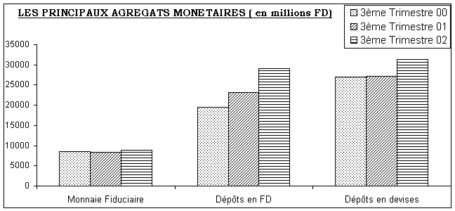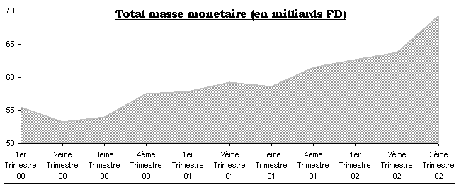 La masse monétaire (M3) qui s’établit à 69,258 milliards FD au cours du 3ème trimestre 2002 affiche une hausse important de 18% sur 12 mois, et également une hausse de 8,7% sur un trimestre. Cette croissance s’explique essentiellement par la hausse des dépôts à vue (+ 22,3 % ) dus aux transferts reçus de l’extérieur au profit de sociétés de construction et d’organismes divers.