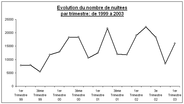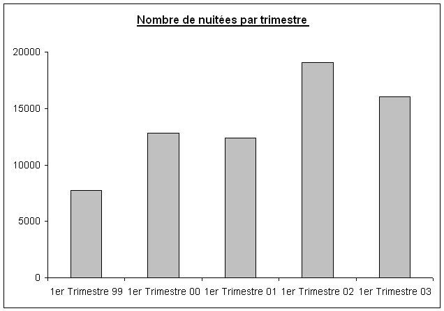 Le nombre des nuitées vendues par les principaux hôtels de Djibouti-ville au cours du 1er trimestre 2003, qui s’établit à 16 043 a connu une baisse de 15 % par rapport à la même période de l’année 2002. Cette diminution s’explique essentiellement par le fait que les contingents militaires américains ont quitté les hôtels pour être logé dans le camp militaire de Douda (Lemonnier).