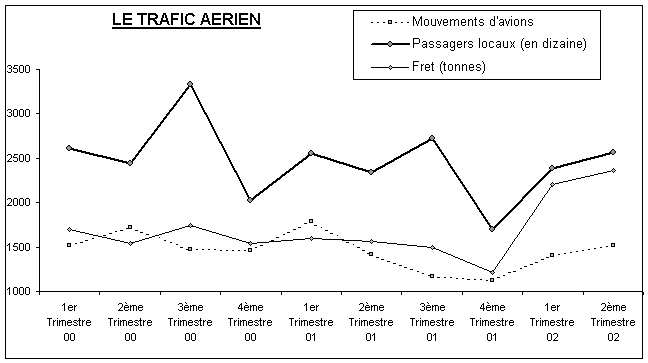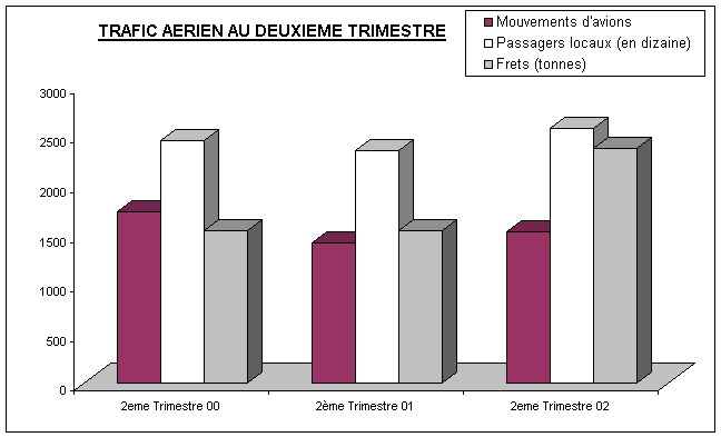 Au cours du 2ème trimestre 2002, toutes les rubriques (mouvements d’avions, passagers locaux et fret) sont en hausse. Outre l’effet des vacances d’été, cette hausse est due à la prise en compte des vols dits militaires (G.A.F, U.S Air force, Forces espagnoles et les vols des Nations Unies) dans la rubrique « Divers » des mouvements d’avions..