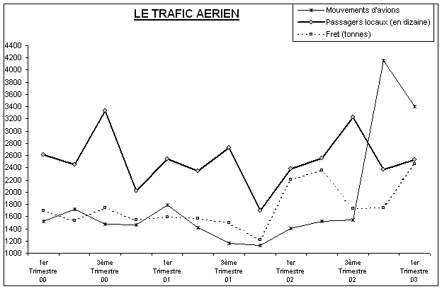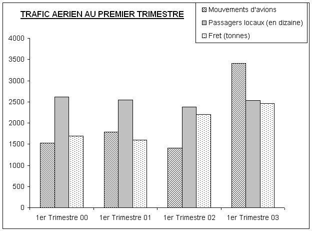 Le total des mouvements d’avions au 1er trimestre 2003 qui s’élève à 3 310 a triplé par rapport à celui enregistré au 31 Mars 2002 (soit 1396 mouvements). Les variations importantes ont été les suivantes :