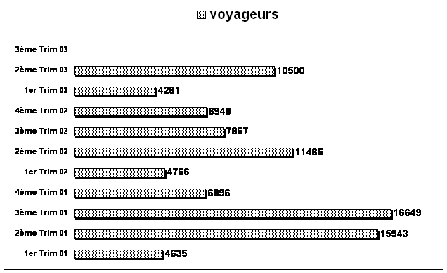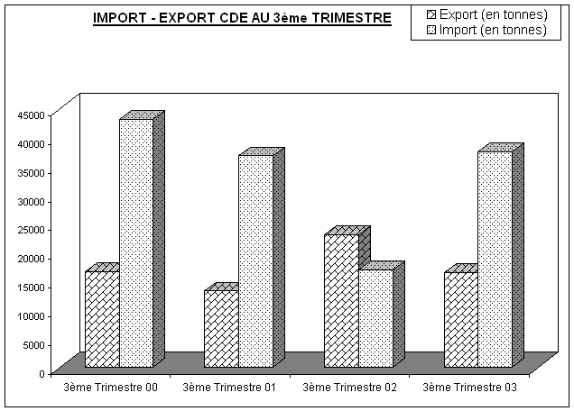· Quant aux voyageurs, ils sont en nombre de 19 744 au 3ème trimestre 2003 contre 7 867 de l’année précédente et enregistre une hausse importante de 151 %. Cette hausse considérable résulte de la période d’été pour les mouvements des vacanciers mais aussi plus particulièrement ceux des personnes immigrés qui ont quitté le pays aux mois de Juillet et d’Août.