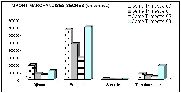 Cette hausse est essentiellement obtenue grâce à la reprise de transbordement (+142%) qui représentent 70,5% des marchandises exportées, tandis que les exportations éthiopiennes ont chuté de 19,7% au cours de ce troisième trimestre à cause des baisses des céréales, des Mélasses, et du bois & cuirs.