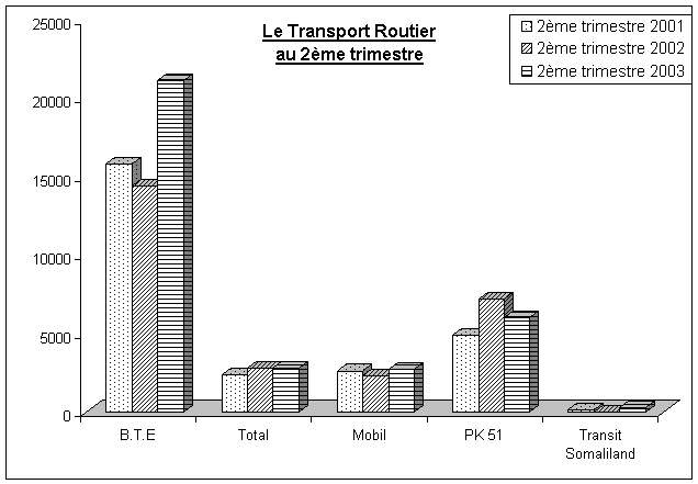 Au cours du 2ème trimestre 2003 le trafic routier commercial entre Djibouti et les pays voisins s’élève à 32 840 mouvements contre 26 629 mouvements enregistrés à la même période de l’année dernière, soit une hausse de + 23,3%.