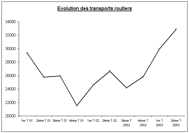 Par ailleurs, on constate une modeste progression (+ 0,5%) dans le trafic à l’entrée de la société Total où l’on a enregistré 2 804 mouvements au 2ème trimestre 2003 contre 2 790 au 2ème trimestre 2002. Celui relevé à l’entrée de Mobil a augmenté de 17% avec 2 690 mouvements de camions.