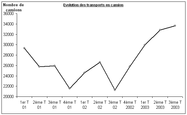 Le trafic des camions enregistrés au 3ème trimestre 2003 à augmenté de 58,3 % en s’élevant à 33 633 mouvements comparé au 3ème trimestre 2002 (21 245 mouvements) et de 2,4 % sur une période de 3 mois (32 842 mouvements).